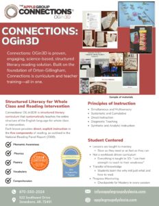 The Apple Group for Dyslexia Search Training Courses/Providers for IDA Approved Credentials: http://applegroupdyslexia.com/ The Apple Group, Inc., is a 501(c)(3) non-profit committed to teaching everyone to read. For the past 26 years, The APPLE Group has trained thousands of educators in multisensory structured literacy and has worked with school districts, universities, and legislators throughout the country teaching the science of reading. Accredited by The International Dyslexia Association at the Accredited Plus level, The APPLE Group provides training in Connections: OG in 3D, a comprehensive, structured literacy curriculum. |