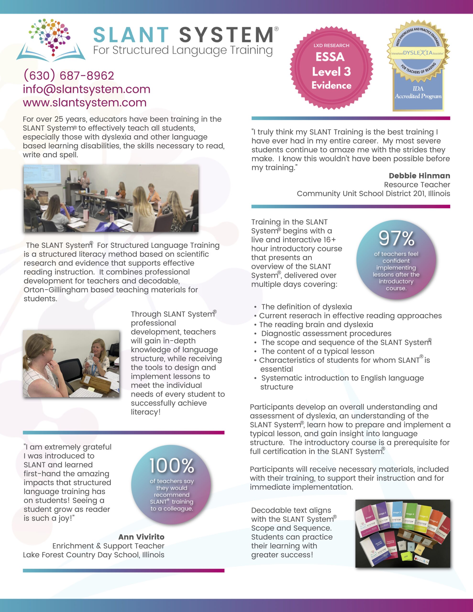Classmates Educational Group, Inc. The SLANT System® is a structured literacy professional development program based on the Orton-Gillingham approach for reading and writing. Training provides all necessary instructional and decodable materials, aligned with a unique scope and sequence. It starts with an introductory course held over multiple days covering dyslexia, the reading brain, phonemic awareness, English language structure, and designing and implementing a lesson. This leads to a one-year supervised practicum with one-on-one coaching and additional professional development throughout the school year.