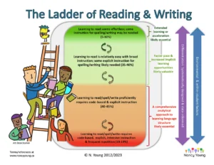 Nancy Young’s “Ladder of Reading & Writing©” infographic demonstrates the variations of ease learning to read/write and the instructional implications. Access that graphic at her website, here.