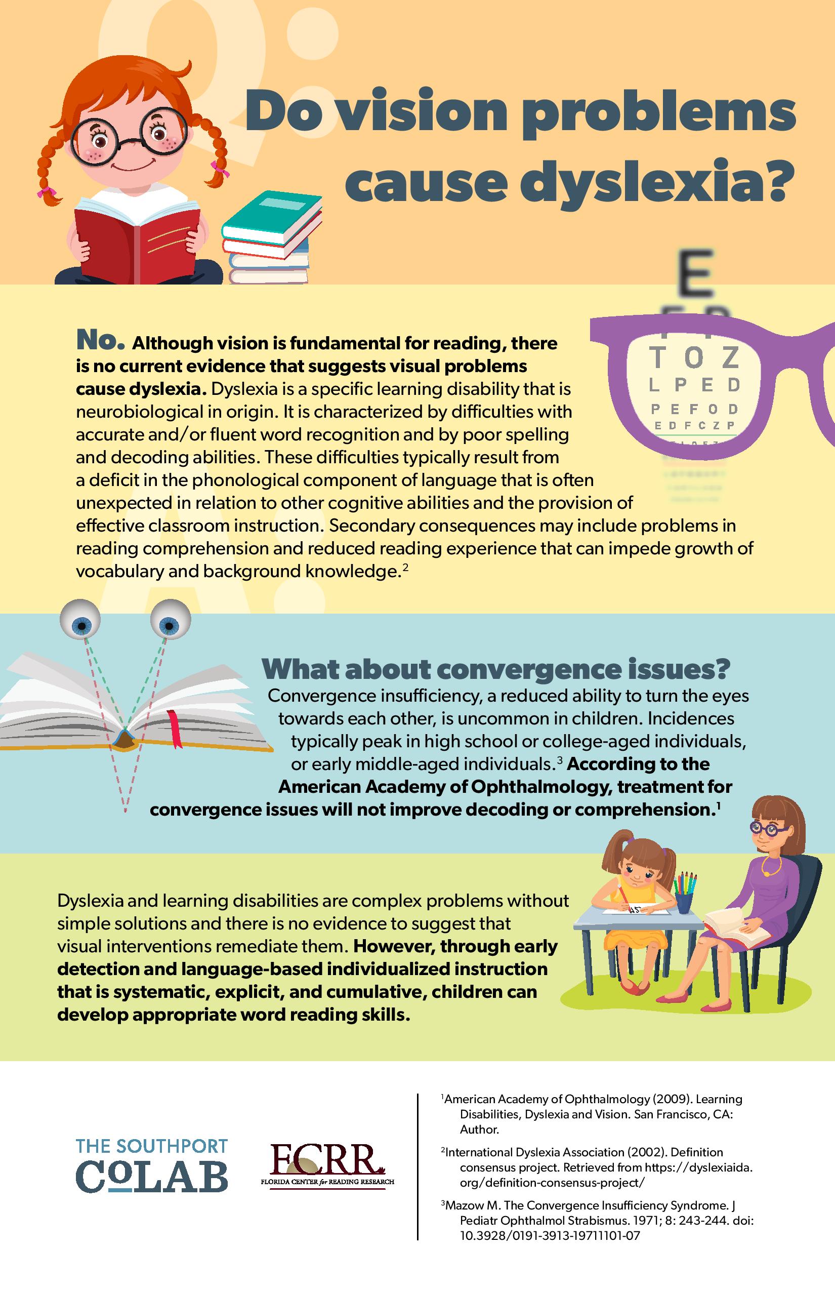 The Southport CoLab and Florida Center for Reading Research created this fantastic infographic tackling common myths about dyslexia and vision. Spoiler Alert—-there’s no evidence that visual problems cause dyslexia, no evidence that treatment for convergence improves decoding or comprehension, and no evidence that visual interventions remediate dyslexia or learning disabilities.