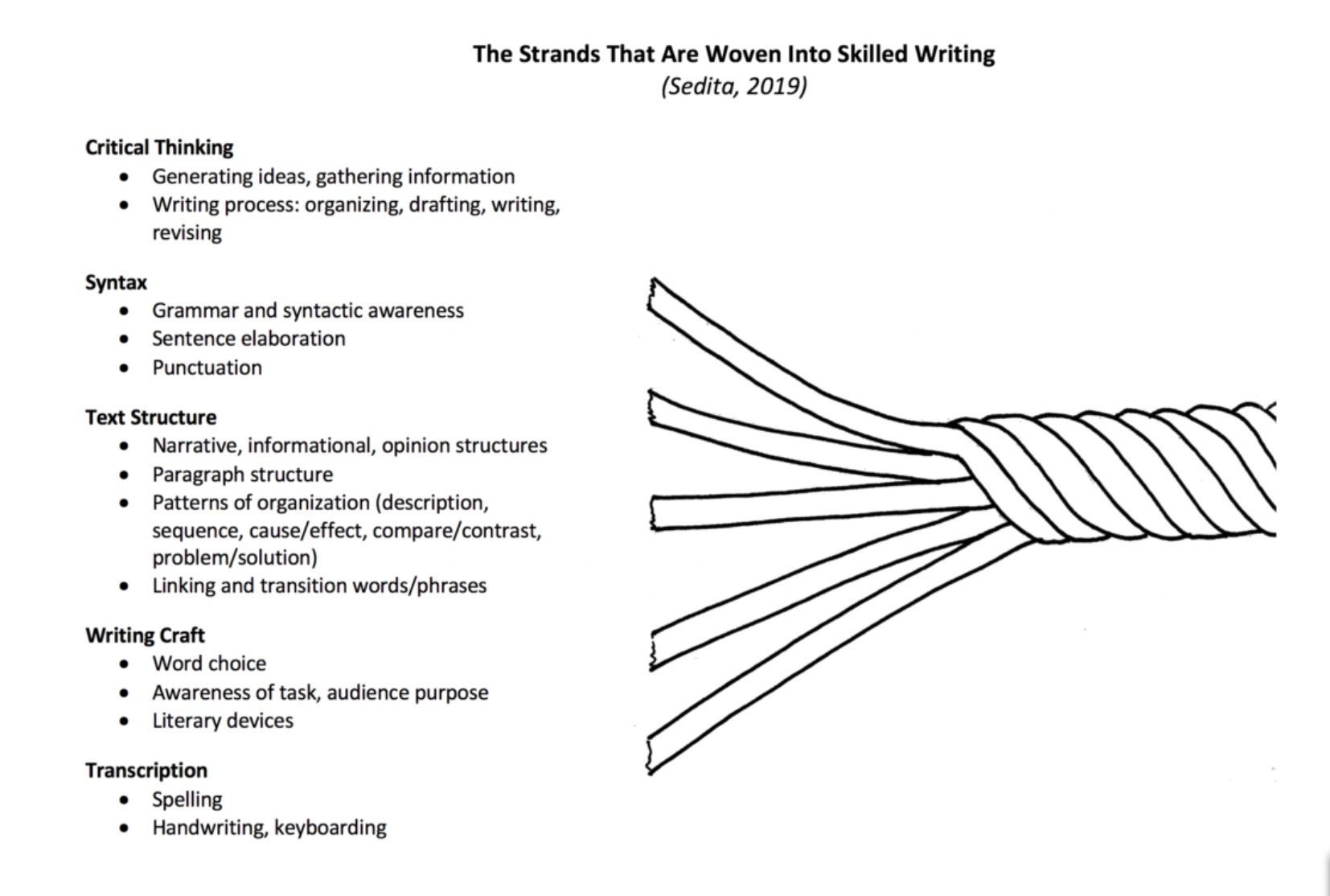 With a nod to Hollis Scarborough’s famous “Reading Rope,” Joan Sedita has created the “Writing Rope.” In Sedita’s words, “ … significant attention is paid to the multi-component nature of skilled reading, while writing tends to be referred to as a single, monolithic skill. I’d like to suggest a model that identifies the multiple components that are necessary for skilled writing—a similar ‘rope’ metaphor can be used to depict the many strands that contribute to fluent, skilled writing. It should be noted that instruction for many skills that support writing also support reading comprehension.”