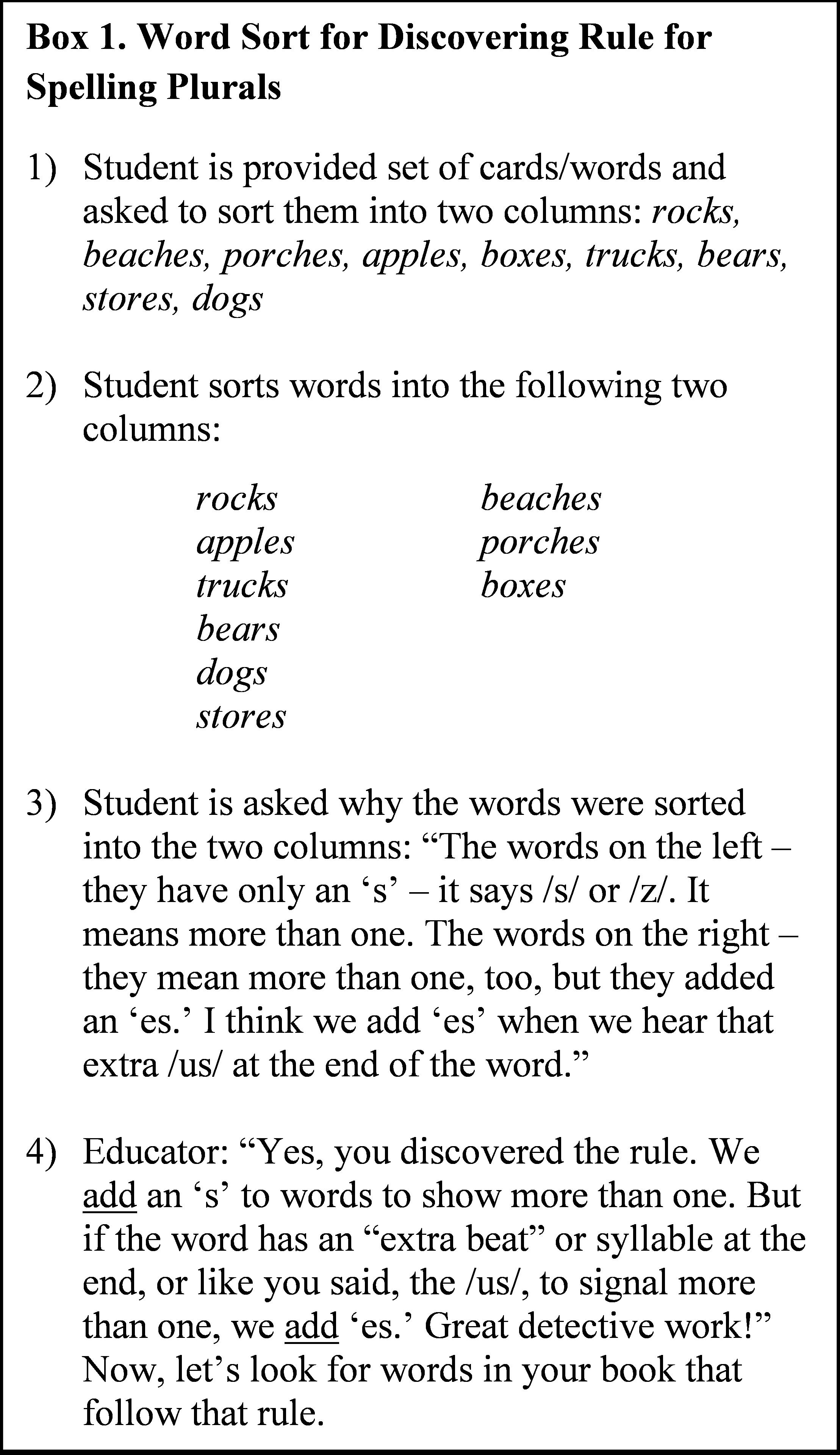 Educators can easily integrate morphological awareness activities into their reading and spelling curricula. For example, some educators already conduct ‘word sorts’ with their students. Word sorts are activities in which students sort individual words into separate columns based on particular commonalities and thereby “discover” a particular pattern or rule. This activity can easily be used to help students discover morphological rules (see Box 1 for an example of a word sort for discovering the rule for plurals). Once the rule has been verbalized, the educator can encourage students to employ the rule by either searching for words in their text that follow the rule and/or spelling words that follow the rule.